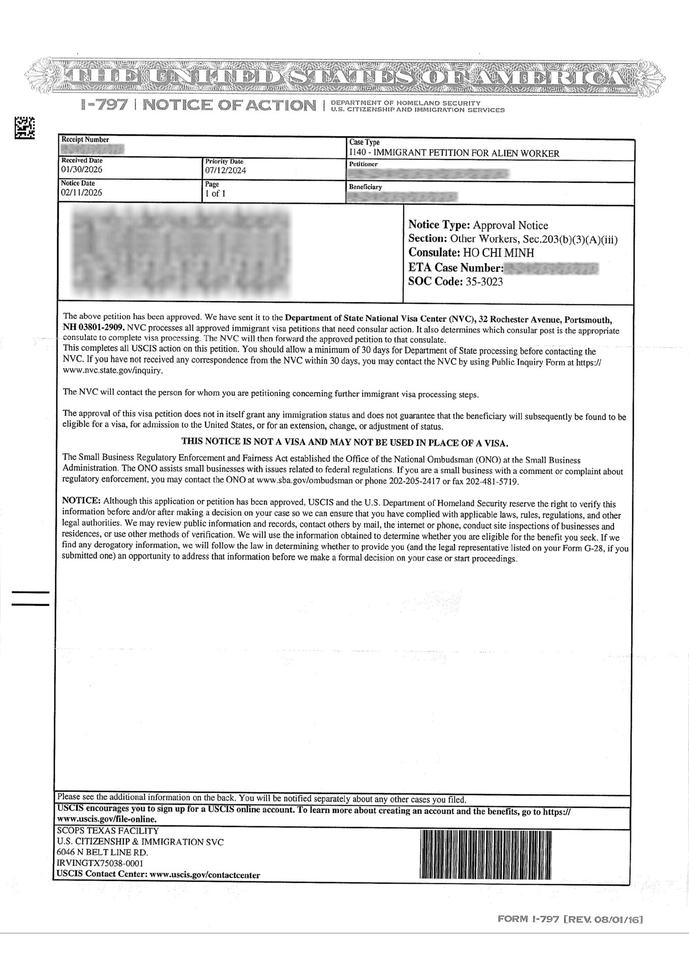 • Ngày 11/02/2026: Tin vui bất ngờ ập đến với chị N.T.T.T. khi hồ sơ I-140 được chấp thuận “siêu tốc”.