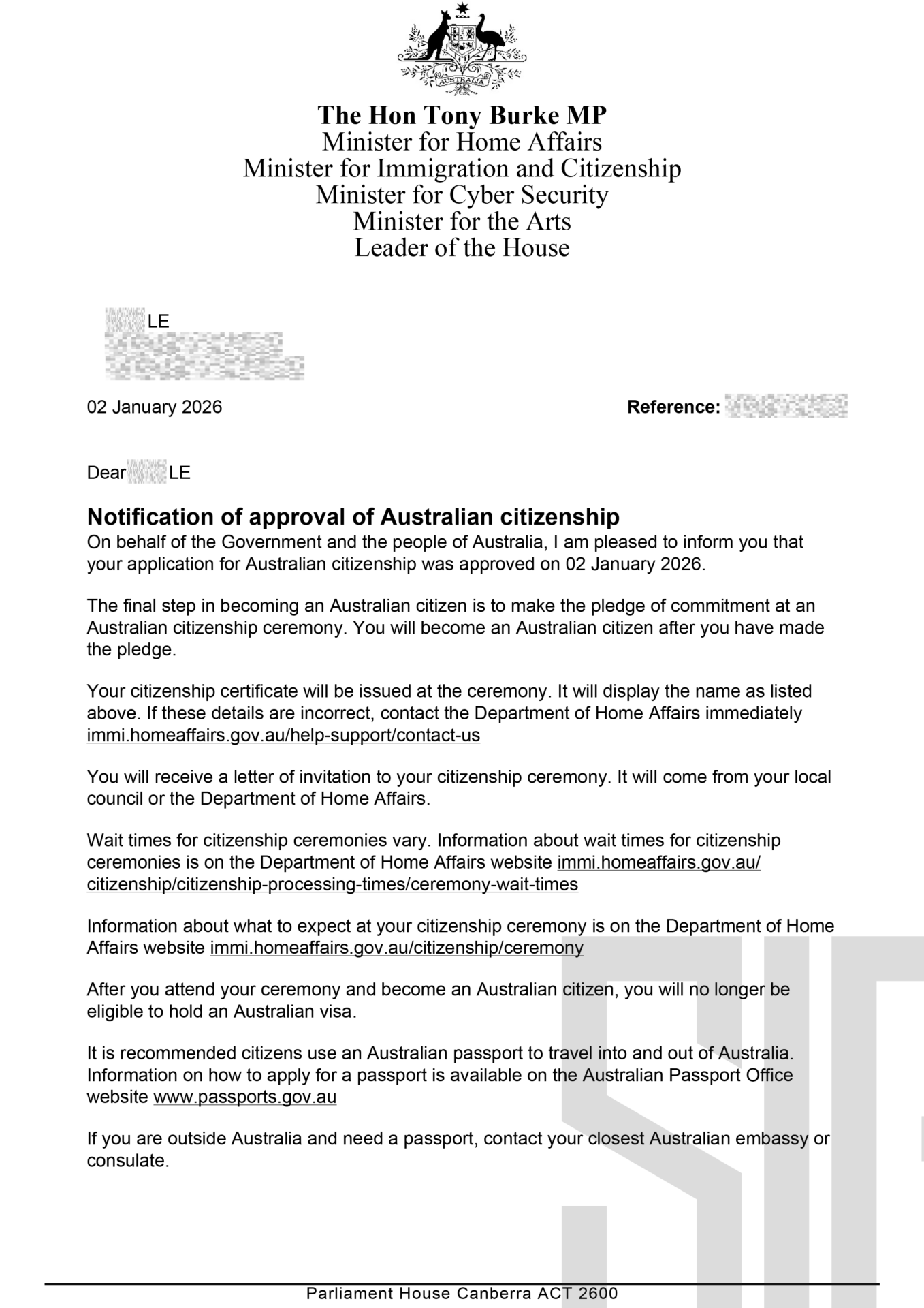 - Ngày 02/01/2026: Tin vui đầu năm mới – anh L.Đ. chính thức được cấp Chứng nhận Quốc tịch Úc, kết thúc hành trình an cư trọn vẹn.