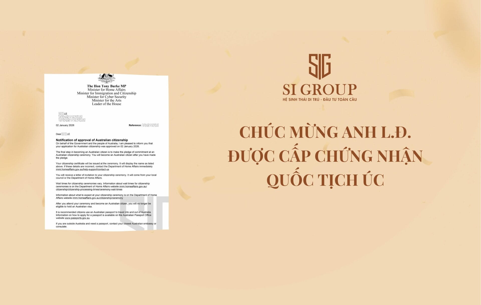 - Ngày 14/06/2025: Đội ngũ SI Group đồng hành chuẩn bị và nộp hồ sơ Quốc tịch Úc cho anh L.Đ.