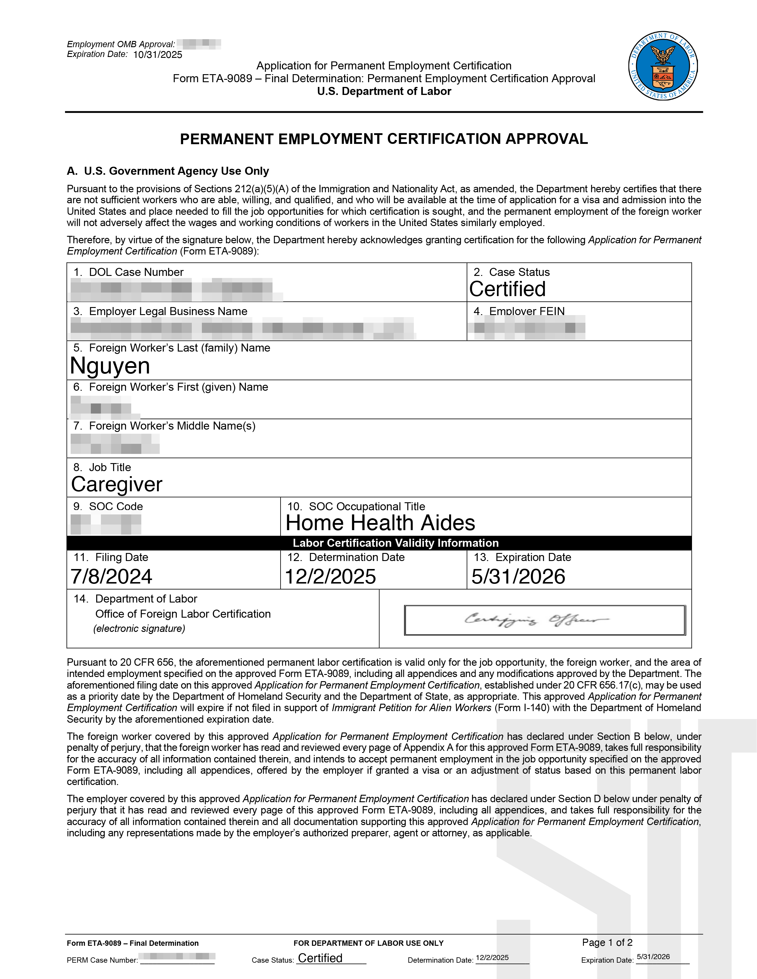 Chúc mừng chị N.T.D.T. chính thức được duyệt Chứng nhận Lao động (Labor Certification – LC) cho vị trí Caregiver tại Dallas, Texas, đánh dấu cột mốc lớn trong hành trình hiện thực hóa giấc mơ định cư Mỹ theo diện EB-3.