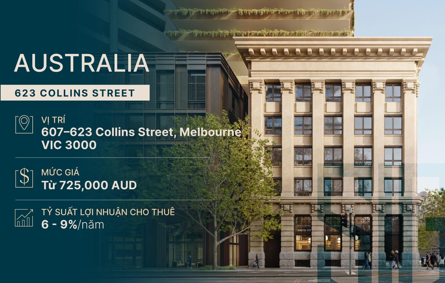 623 Collins Street là dự án căn hộ – thương mại cao cấp tọa lạc trên Collins Street, con đường tài chính quan trọng và sang trọng bậc nhất Melbourne CBD. Dự án sở hữu thiết kế hiện đại pha nét cổ điển Melbourne, kết hợp không gian sống cao cấp với trung tâm thương mại – văn phòng ngay trong cùng khối tháp.