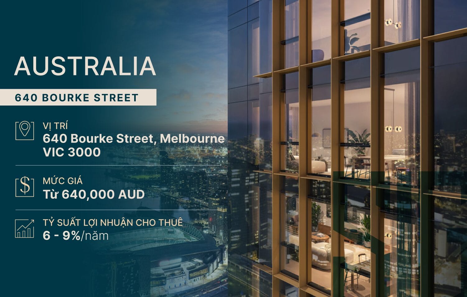 640 Bourke Street là dự án căn hộ cao cấp tọa lạc ngay trung tâm Melbourne CBD, nằm trên trục Bourke Street sầm uất, nơi hội tụ văn phòng, trường đại học, trung tâm thương mại và các tiện ích quốc gia. Dự án được phát triển theo phong cách đô thị hiện đại của Melbourne, tối ưu ánh sáng tự nhiên, không gian mở và tầm nhìn hướng skyline đầy ấn tượng.