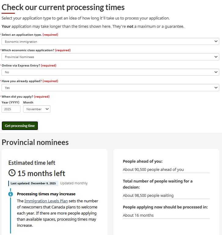 Thời gian xử lý hồ sơ chương trình Đề cử tỉnh bang Canada