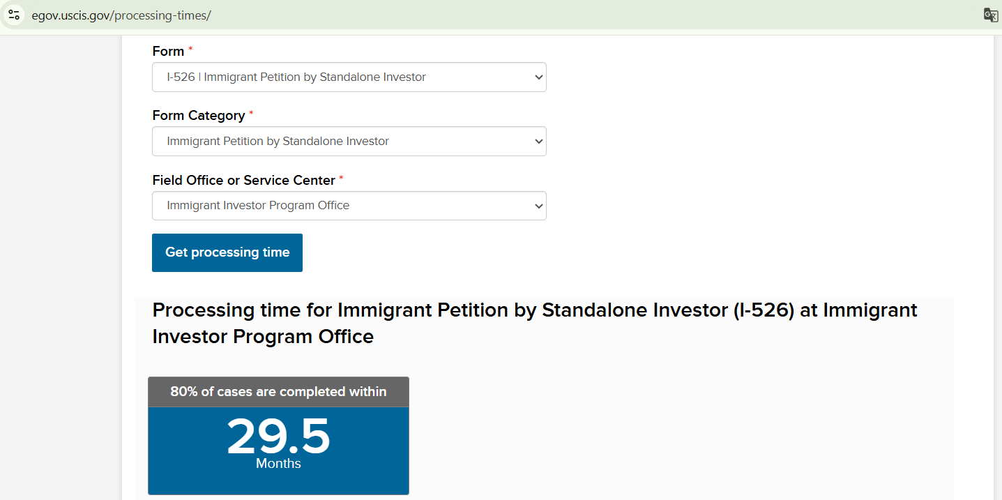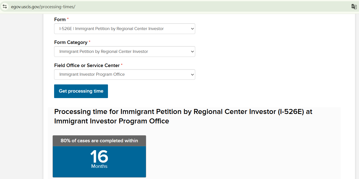Thời gian xử lý Mẫu đơn I-526/I-526E (Đơn xin nhập cư dành cho các nhà đầu tư độc lập/Trung tâm Vùng)