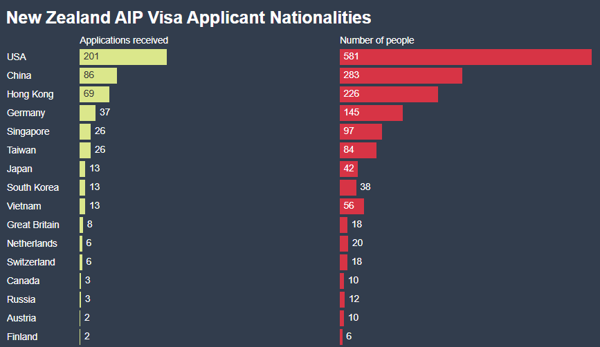 • Nhà đầu tư Mỹ chiếm tỷ lệ lớn so với các nhà đầu tư nước ngoài đến New Zealand: Trong tổng số hồ sơ, các nhà đầu tư Mỹ dẫn đầu với 201 đơn, chiếm khoảng 38% tổng lượng đăng ký. Con số này vượt xa các thị trường truyền thống khác như Trung Quốc (86 đơn) hay Hong Kong (69 đơn).